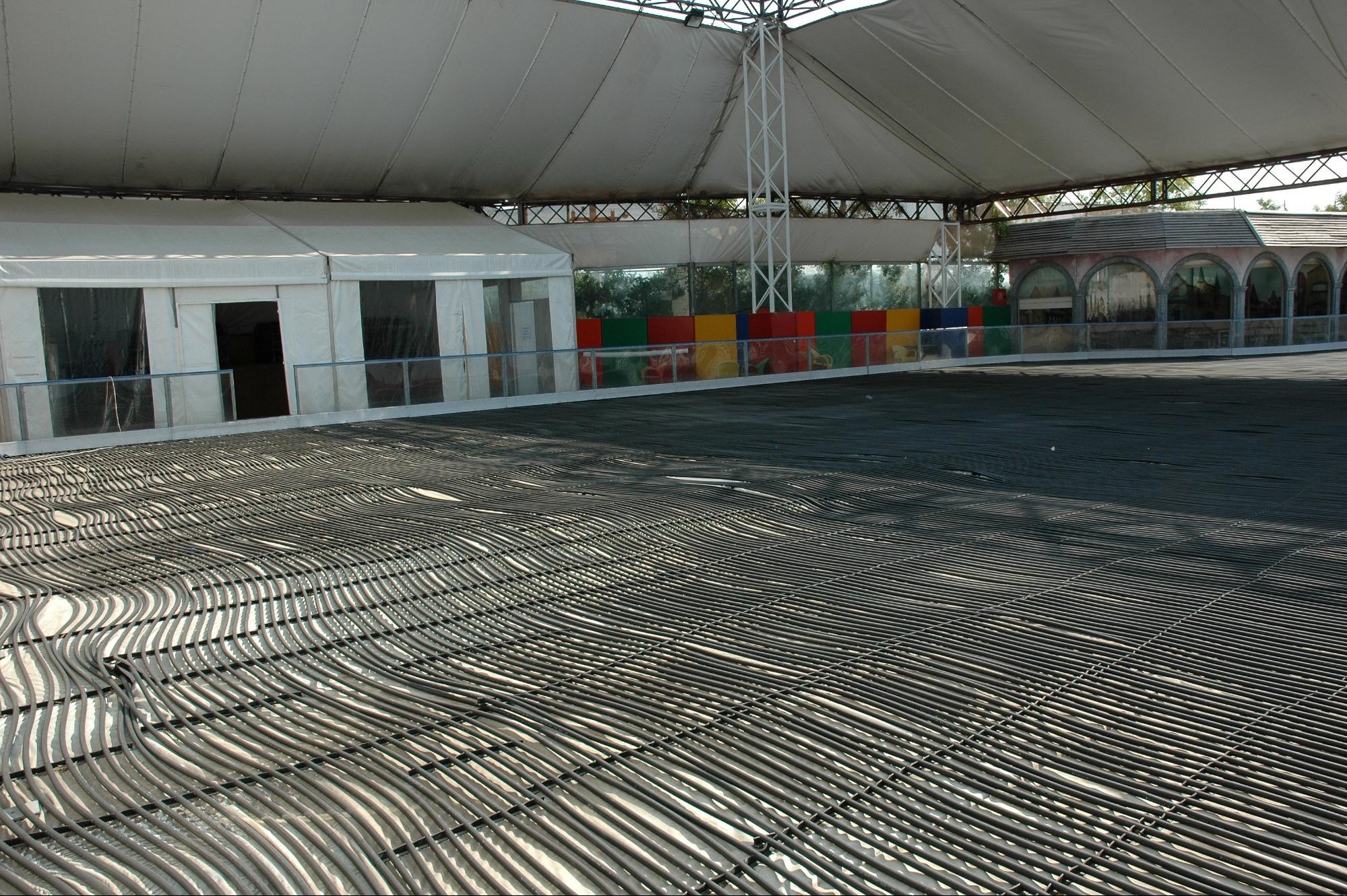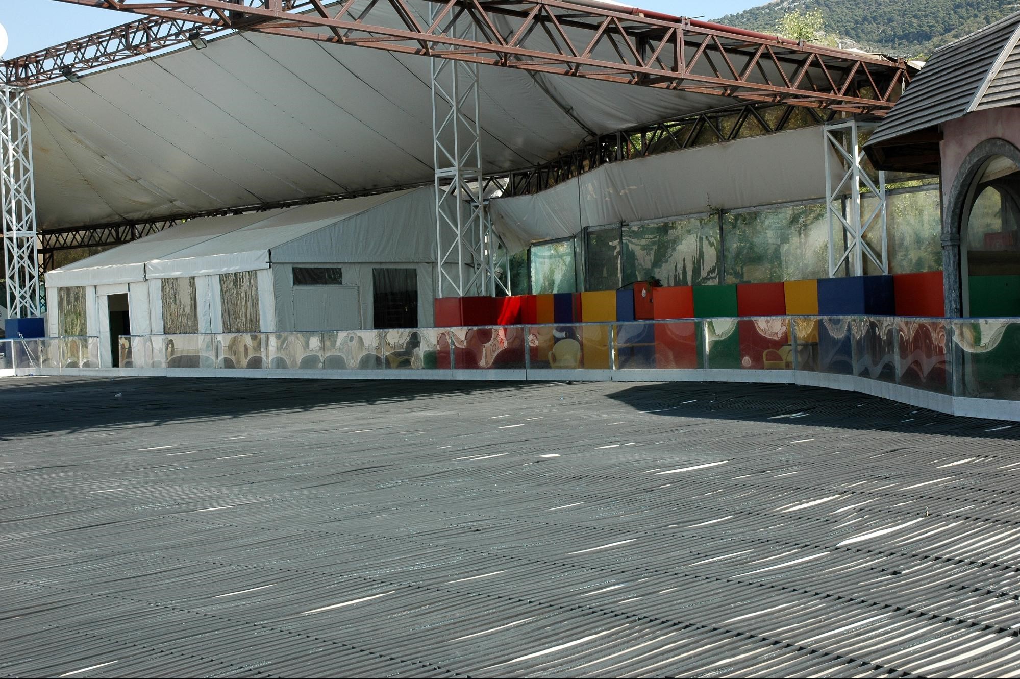 Οι υπόλοιποι σταθεροί τοίχοι καθώς και το πάτωμα θα επενδυθούν με ειδικό ηχοαπορροφητικό υλικό που θα λειτουργεί επίσης σαν οθόνη προβολής εξασφαλίζοντας τη δυνατότητα προβολής σε 360ο και στις δύο διαστάσεις. Τον σταθερό εξοπλισμό του χώρου θα τον συμπληρώσουν ειδικά projection nets, που θα λειτουργούν και σαν ηχοπαγίδες, όπου αυτό κριθεί απαραίτητο, καθώς και διάφορες δομικές κατασκευές που θα βελτιώνουν την ψευδαίσθηση και θα βοηθούν στον αποτελεσματικότερο ηχητικό- φωτιστικό έλεγχο.